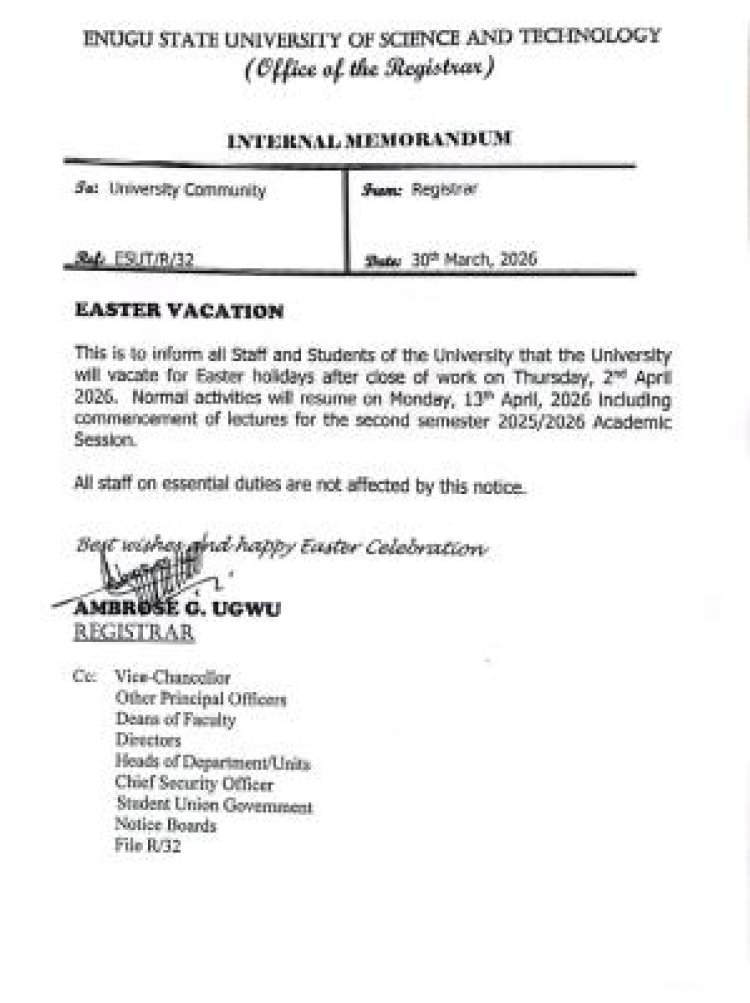 The Enugu State University of Science and Technology has announced the commencement of its Easter holidays, directing staff and students to proceed on break after close of work on Thursday, April 2, 2026.