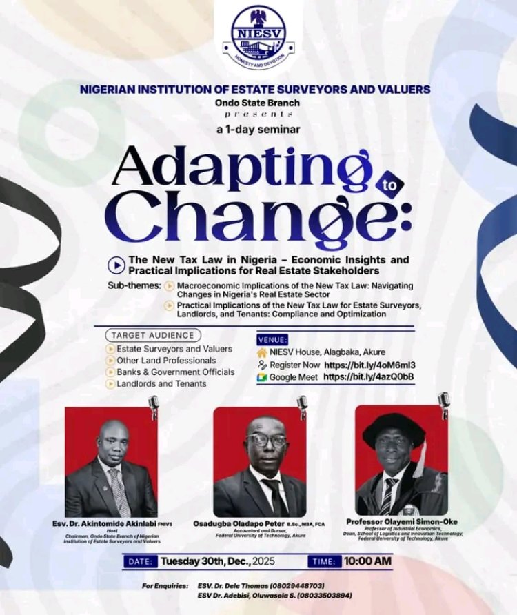 This position was articulated at a seminar organised by the Nigerian Institution of Estate Surveyors and Valuers (NIESV), Ondo State Branch, held at the Federal University of Technology, Akure (FUTA). The seminar was themed “Adapting to Change: The New Tax Law in Nigeria – Economic Insights and Practical Implications for Real Estate Stakeholders.”
