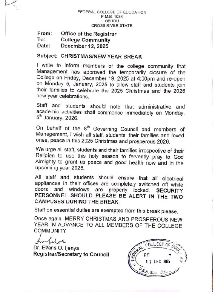 The Management of the Federal College of Education, Obudu has approved a temporary closure of the College to allow staff and students to observe the 2025 Christmas and 2026 New Year celebrations.