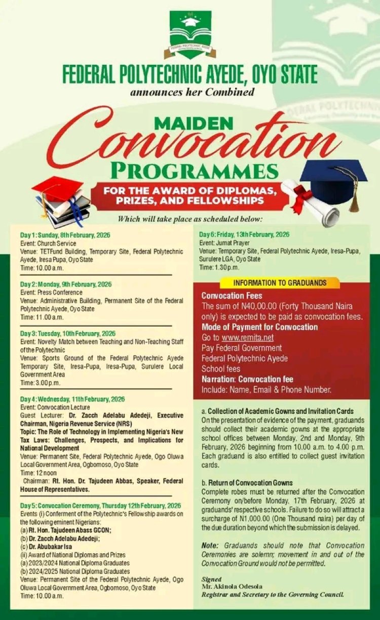 The Federal Polytechnic, Ayede, Oyo State, has announced the schedule for its maiden Convocation Ceremonies, which will include the award of Diplomas, prizes, and fellowships.