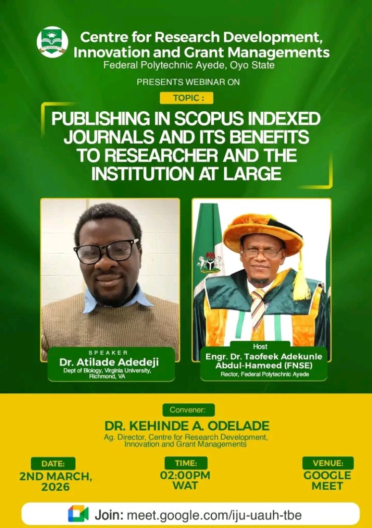 In a strategic effort to elevate research standards and global visibility, the Centre for Research Development, Innovation and Grant Management of Federal Polytechnic Ayede will host a webinar titled “Publishing in Scopus Indexed Journals and Its Benefits to Researchers and the Institution at Large” on Monday, 2nd March 2026 at 2:00 PM WAT via Google Meet.