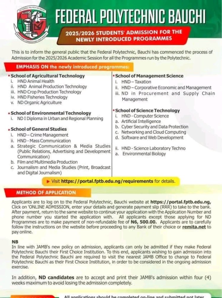 The Federal Polytechnic, Bauchi, has commenced the admission process for the 2025/2026 academic session, with a strong emphasis on several newly introduced academic programmes across its schools.