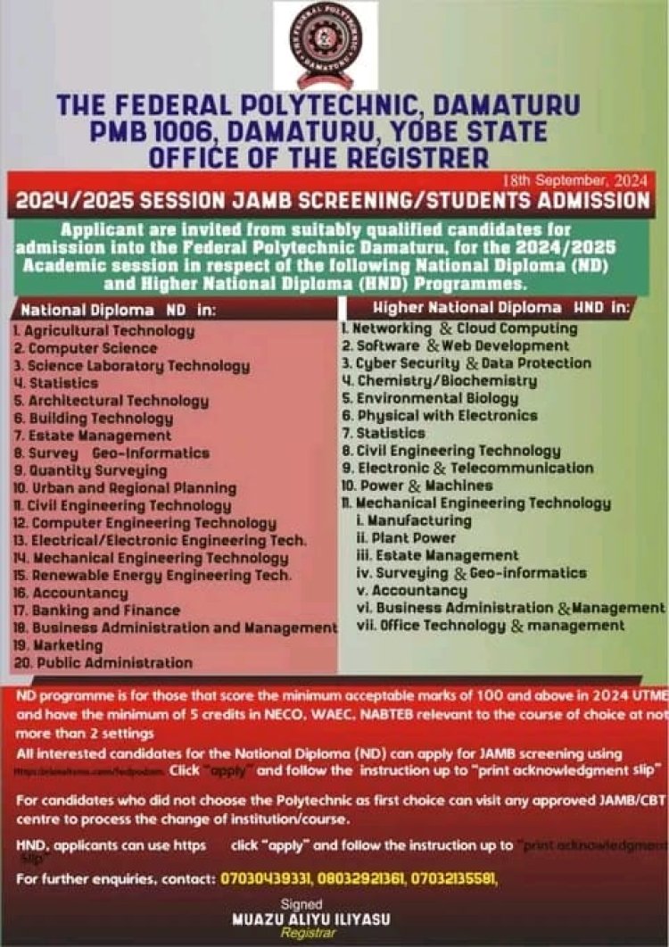 The Federal Polytechnic Damaturu has announced its admission screening exercise for the 2024/2025 academic session. Prospective candidates can apply for National Diploma (ND) and Higher National Diploma (HND) programs