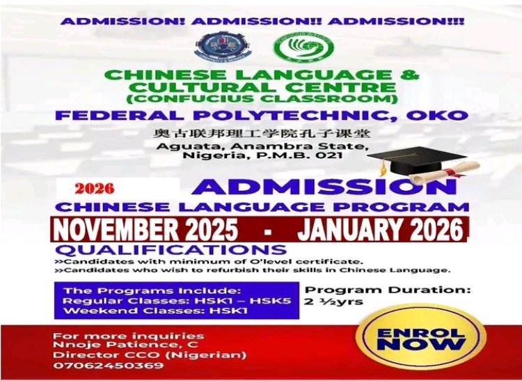 The Federal Polytechnic, Oko, has announced that admission into its Chinese Language Programme is still ongoing.