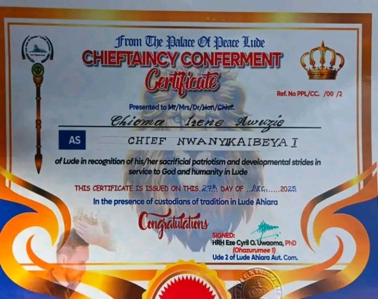 History was made on Friday, December 26, 2025, as the Rector of Federal Polytechnic Oko, Dr. Chioma Irene Awuzie, was conferred with a prestigious chieftaincy title by the King of Lude Ahiara Autonomous Community, Imo State.