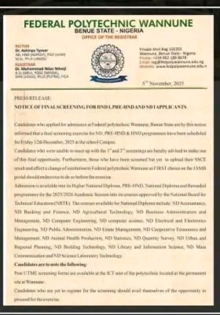 The Federal Polytechnic Wannune, Benue State, has officially announced the final screening exercise for candidates seeking admission into ND, PRE-HND, and HND programmes for the 2025/2026 academic session.