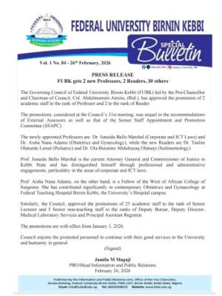 The Governing Council of FUBK, chaired by Pro-Chancellor Col. Abdulmumini Aminu (Rtd.), has approved the promotion of key academic and non-teaching staff, effective January 1, 2026.