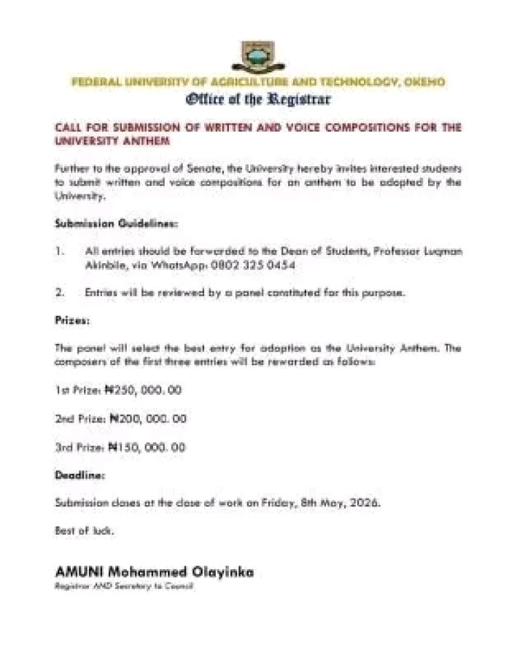 The Federal University of Agriculture and Technology, Okeho (FUNATO), has invited students to submit written and vocal compositions for the development of an official university anthem.