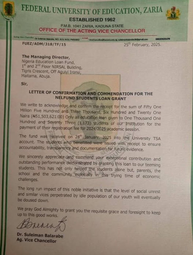 The Federal University of Education, Zaria (FUEZ) has commended the Nigeria Education Loan Fund (NELFUND) for disbursing N51.5 million to 1,173 students for the 2024/2025 academic session. In a letter signed by Acting Vice-Chancellor, Dr. Suleiman Balarabe, the university confirmed receiving the funds on January 28, 2025, which were used for students' registration fees with full accountability.