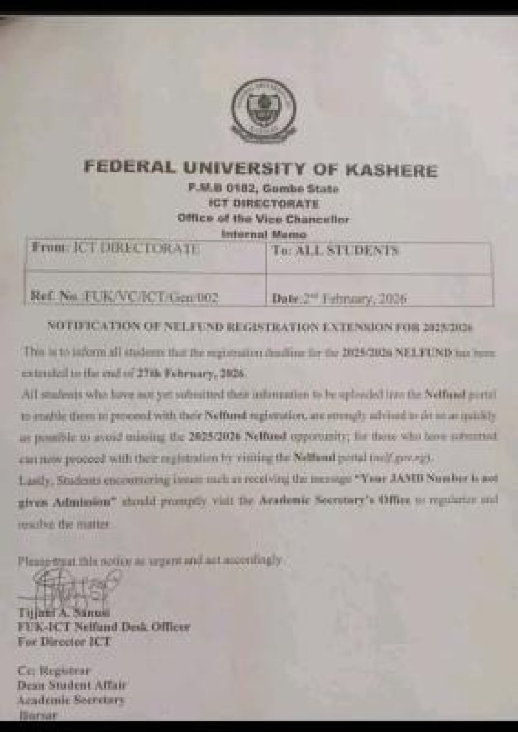 The ICT Directorate of the Federal University of Kashere (FUK) has announced an extension for the 2025/2026 Nigerian Education Loan Fund (NELFUND) registration.