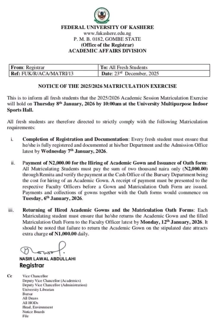 The Federal University of Kashere (FUK) has officially announced the date for its 2025/2026 Academic Session Matriculation Exercise for all fresh students.