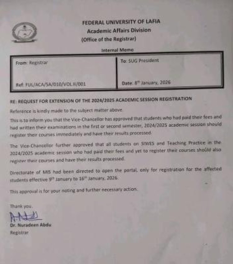 The Office of the Registrar at the Federal University of Lafia (FUL) has announced a one-week extension for course registration for the 2024/2025 academic session, following approval by the Vice-Chancellor.