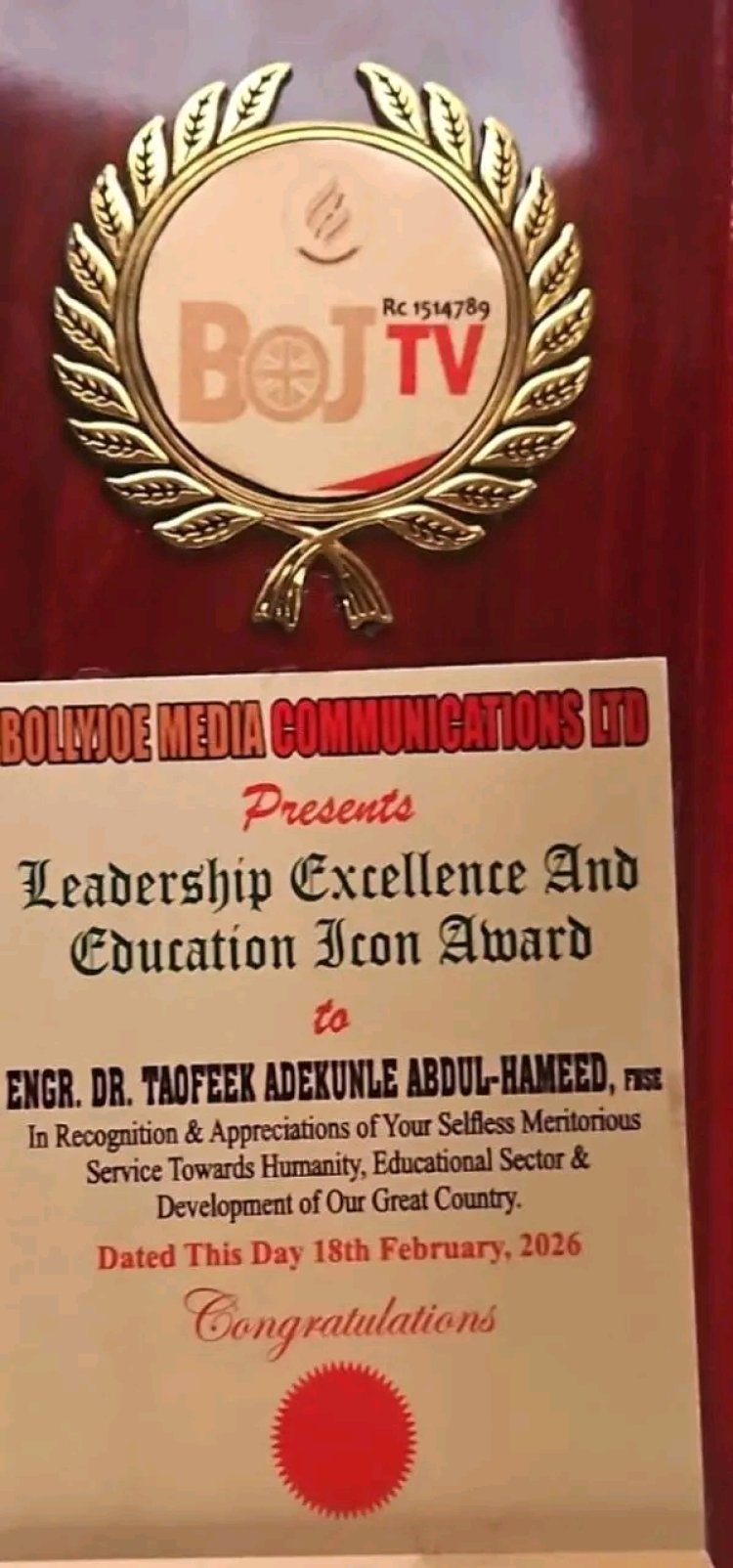 Presented by Bollyjoe Media Communications Ltd, a leading media and communications firm based in Wuse Zone 1, Abuja, the award recognises Dr. Abdul-Hameed’s transformative leadership, selfless service, and visionary approach in Nigeria’s polytechnic education sector. The award, dated 18th February 2026, was endorsed by the Managing Director/CEO, Joseph Uzuakpundu Bollyjoe, and highlights the Rector’s growing national prominence as an education administrator and development-oriented leader.