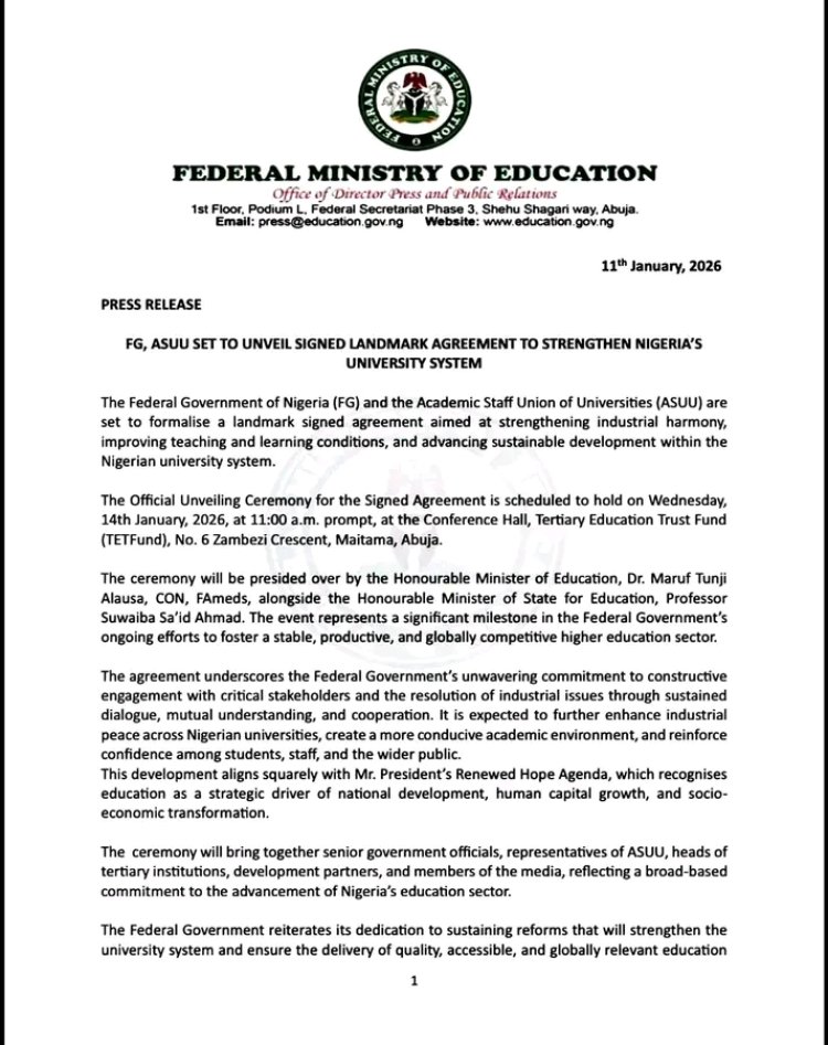 The Federal Government and the Academic Staff Union of Universities (ASUU) are set to formally unveil a newly signed agreement designed to strengthen industrial harmony, improve teaching and learning conditions, and support sustainable development across Nigeria’s university system.
