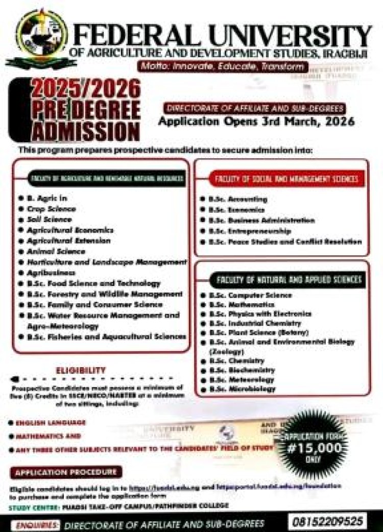 The Federal University of Agriculture and Development Studies, Iragbiji (FUADSI) has officially commenced applications for its 2025/2026 Pre-Degree Programme, aimed at preparing candidates for admission into undergraduate degree programmes.