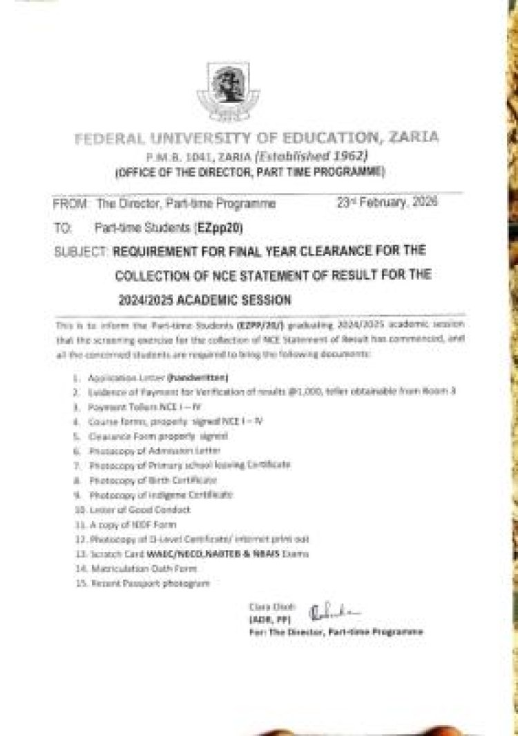 The Federal University of Education, Zaria (FUEZ) has directed all part-time students with matriculation numbers beginning with EZPP/20, graduating in the 2024/2025 session, to commence their clearance procedures.