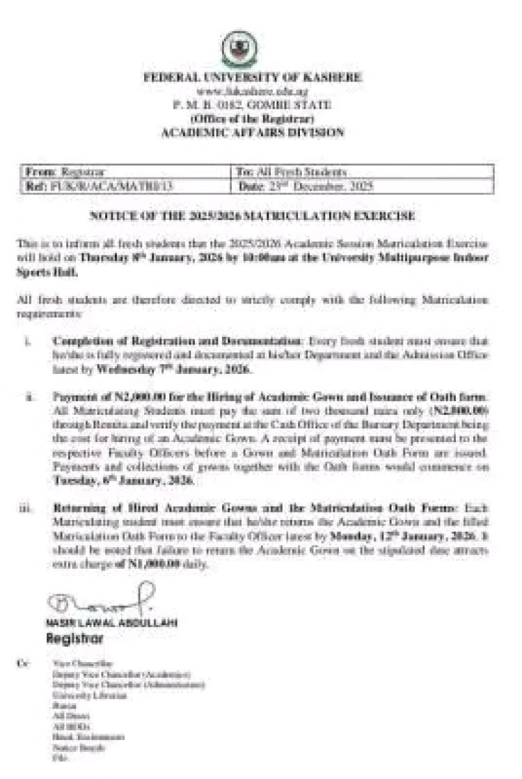The Federal University of Kashere (FUKashere), Gombe State, has announced that its matriculation ceremony for newly admitted students for the 2025/2026 Academic Session will hold on Thursday, January 8, 2026.