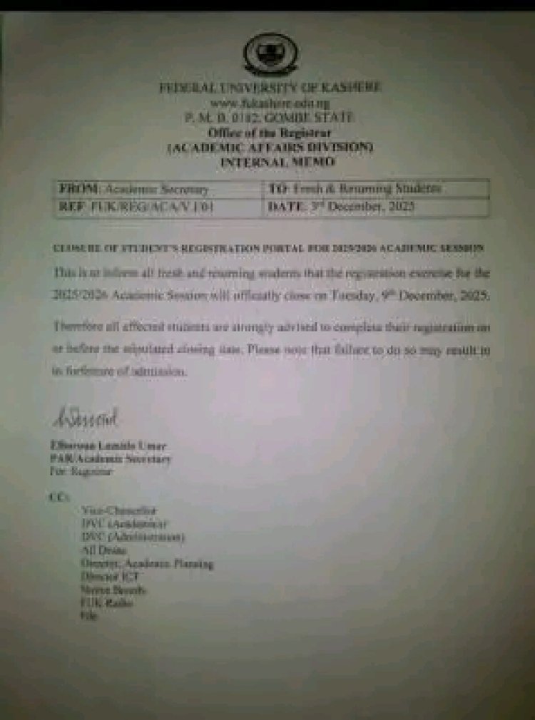 The memo, dated December 3, 2025, was circulated to strategic university offices including the Vice-Chancellor, Deputy Vice-Chancellors, all Deans, the Director of ICT, Academic Planning Unit, and was also announced via FUK Radio.