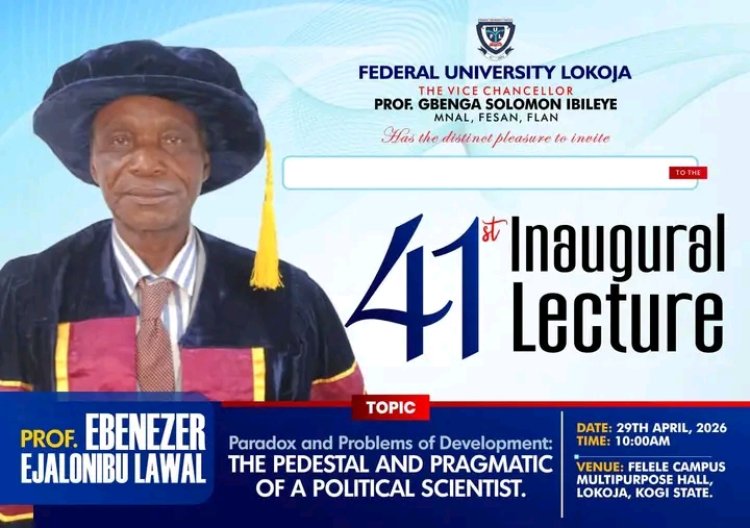 The Federal University Lokoja has announced the 41st edition of its Inaugural Lecture series, scheduled to hold on Wednesday, April 29, 2026, at 10:00 a.m. at the Multipurpose Hall, Felele Campus.