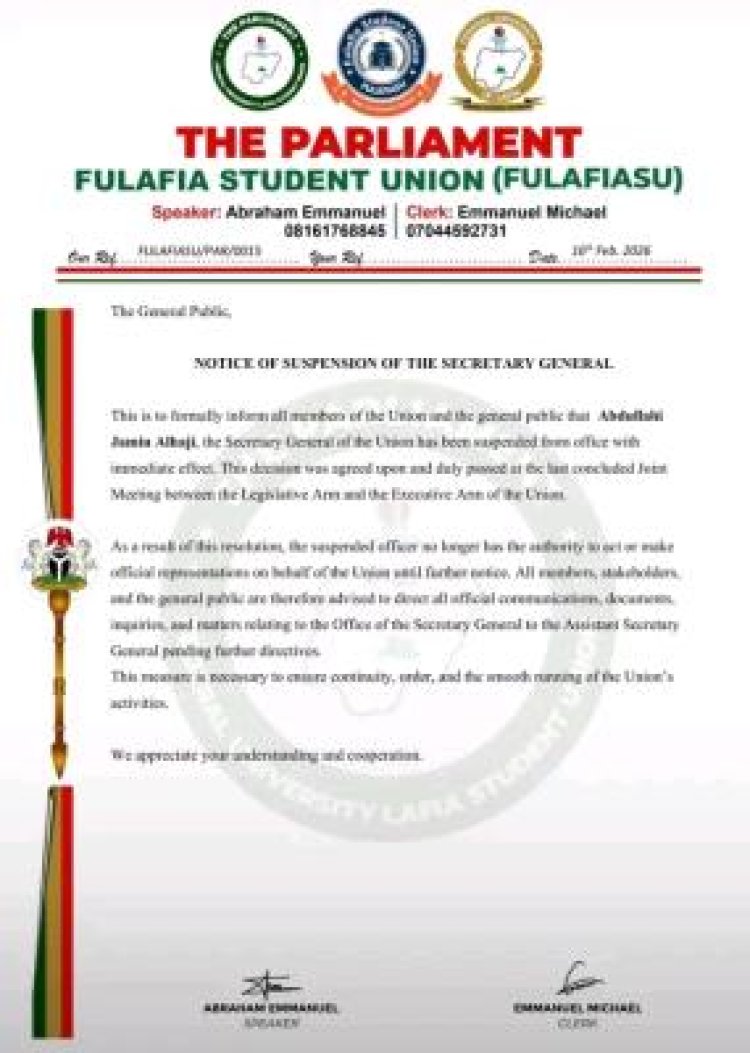 The Federal University Lafia Students’ Union Government (FULAFIA SUG) has announced the immediate suspension of its Secretary General, Abdullahi Jamiu Alhaji.