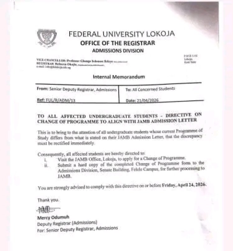 The Management of Federal University Lokoja (FULOKOJA), through the Office of the Registrar, has released an urgent directive to undergraduate students whose current programme of study differs from the course stated on their official JAMB Admission Letter.