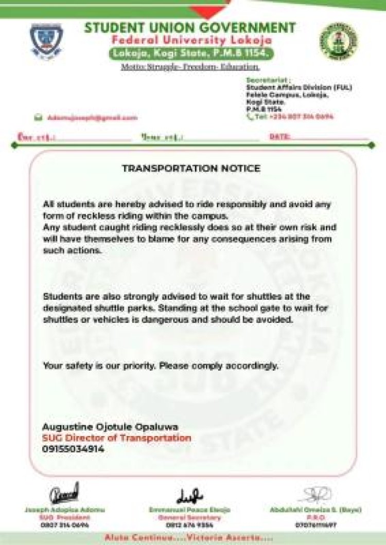 The Student Union Government (SUG) of the Federal University Lokoja has released a transportation advisory urging students to prioritize safety while commuting within the campus.