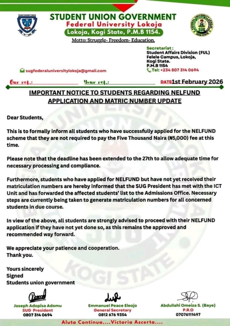 The Students’ Union Government (SUG) of Federal University Lokoja (FULOKOJA) has issued an update regarding the NELFUND application process and matriculation number allocation.