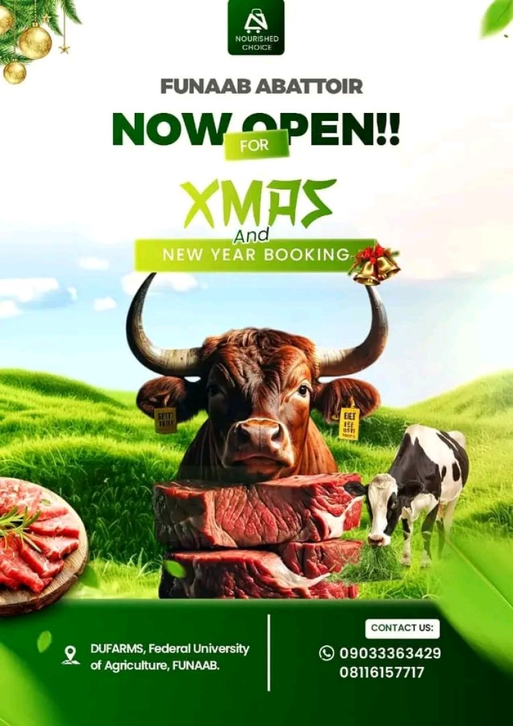 The Federal University of Agriculture, Abeokuta (FUNAAB) Abattoir has announced the commencement of its Christmas cow sharing exercise starting Tuesday, December 23, 2025.