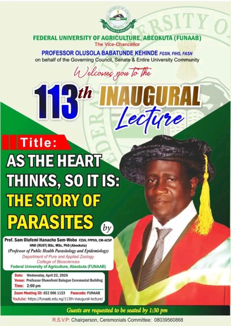 The lecture will be streamed live on YouTube via: https://funaab.edu.ng/event/113th-inaugural-lecture/ and on Facebook at https://www.facebook.com/share/18FgpL1gJc/