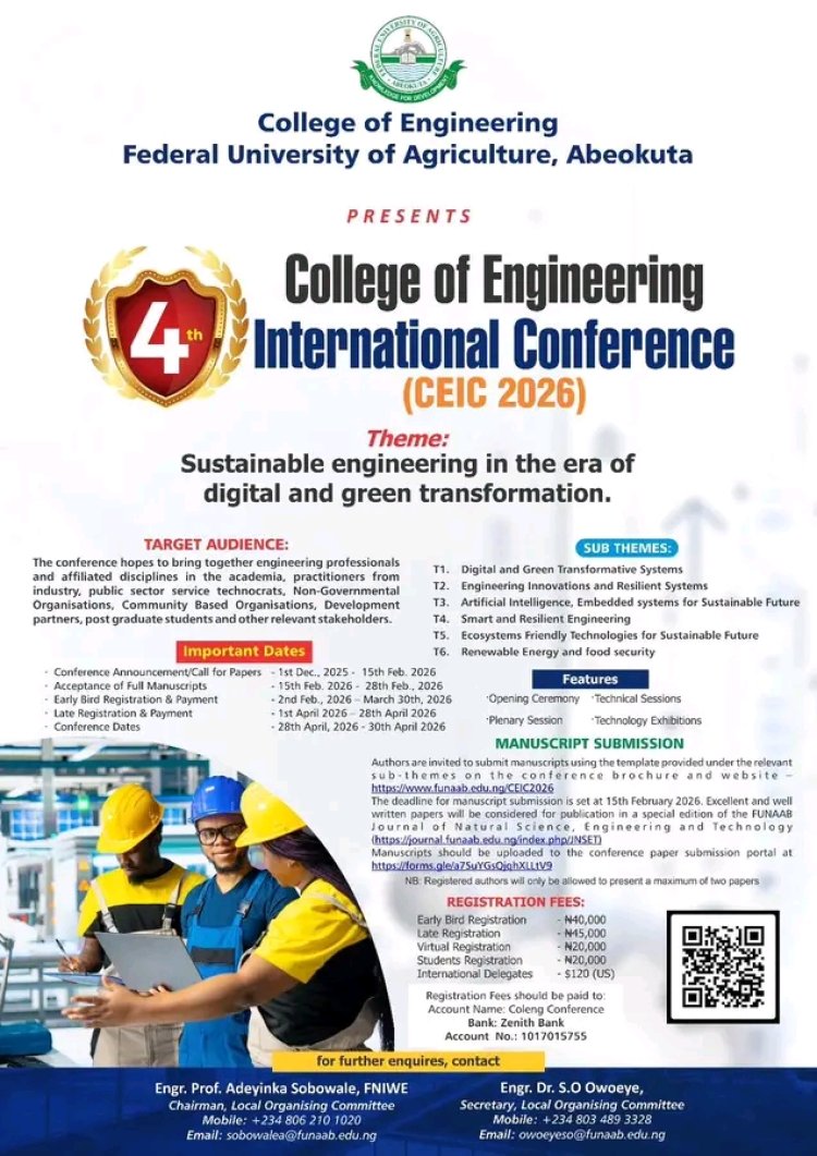 The College of Engineering, Federal University of Agriculture, Abeokuta (FUNAAB), has officially announced the 4th College of Engineering International Conference (CEIC 2026).