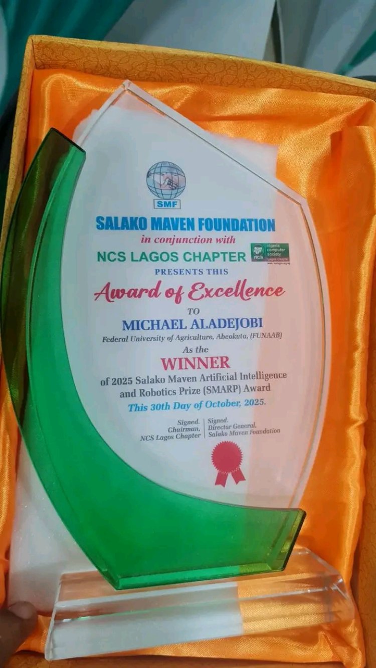Michael Aladejobi, a Computer Science graduate of the Federal University of Agriculture, Abeokuta (FUNAAB), has been named the overall winner of the 2025 Salako Maven Artificial Intelligence and Robotics Prize (SMARP), triumphing over competitors from tertiary institutions nationwide.