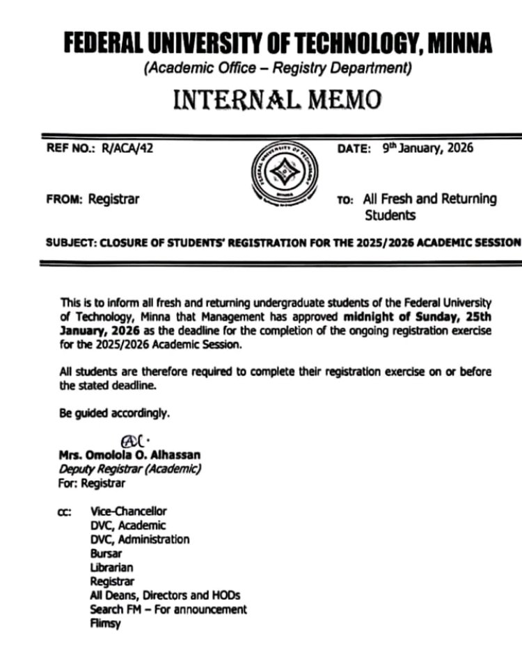 The Management of the Federal University of Technology, Minna (FUT Minna) has announced midnight of Sunday, 25 January 2026 as the final deadline for the completion of the 2025/2026 academic session registration for all undergraduate students.