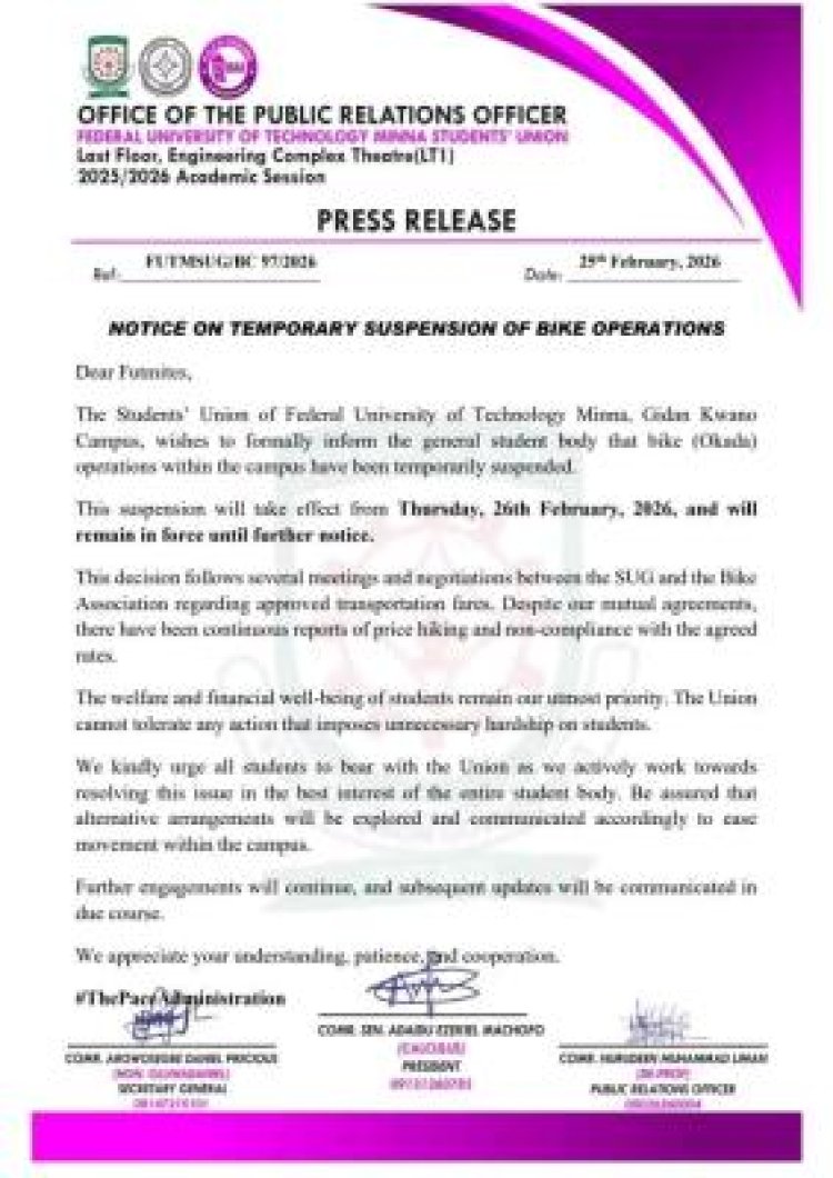 The Students' Union Government (SUG) of the Federal University of Technology, Minna (Gidan Kwano Campus) has announced the immediate suspension of all bike (Okada) operations within the campus. The directive, effective from Thursday, 26th February 2026, will remain in force until further notice.