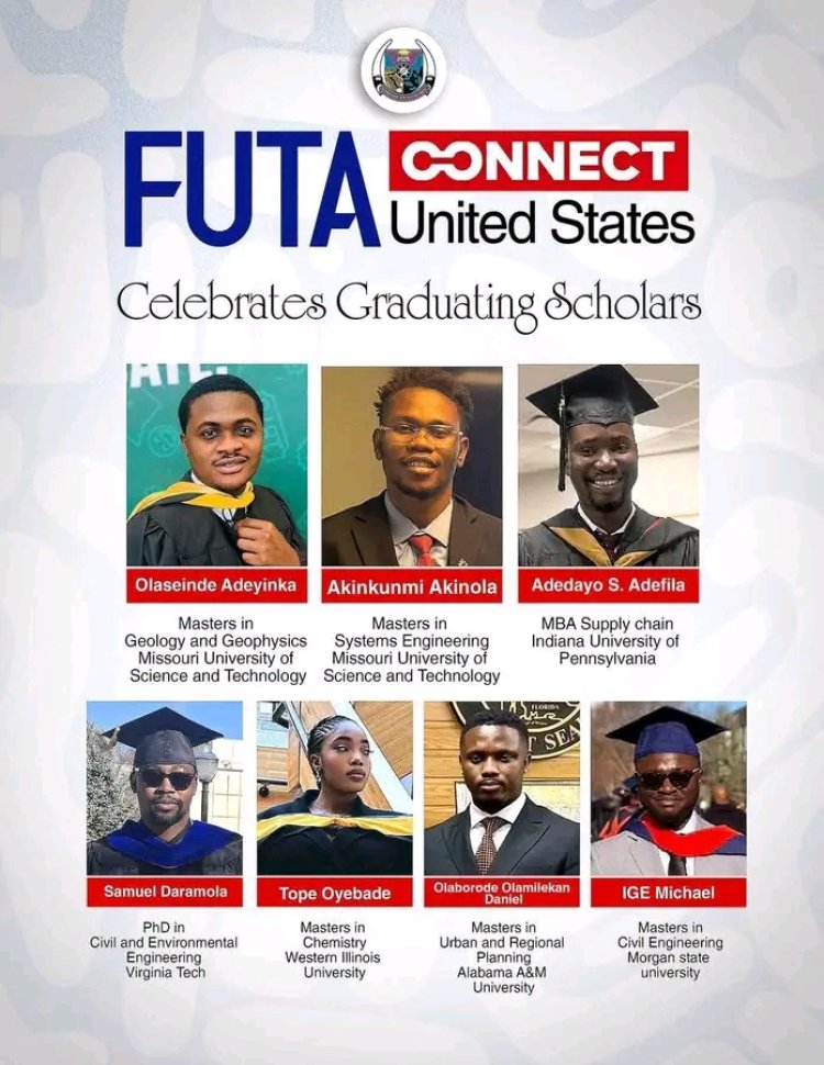 The Federal University of Technology, Akure (FUTA) proudly recognises the exceptional accomplishments of its alumni in the United States who have recently earned Master’s and PhD degrees across diverse fields.