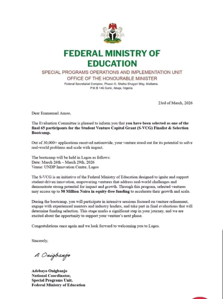 An alumnus of the Federal University of Technology Akure, Emmanuel Amoo, alongside his associate Fortune Vaughan, has secured a ₦50 million Federal Government Student Venture Capital Grant under the Federal Ministry of Education initiative implemented in partnership with the Bank of Industry.
