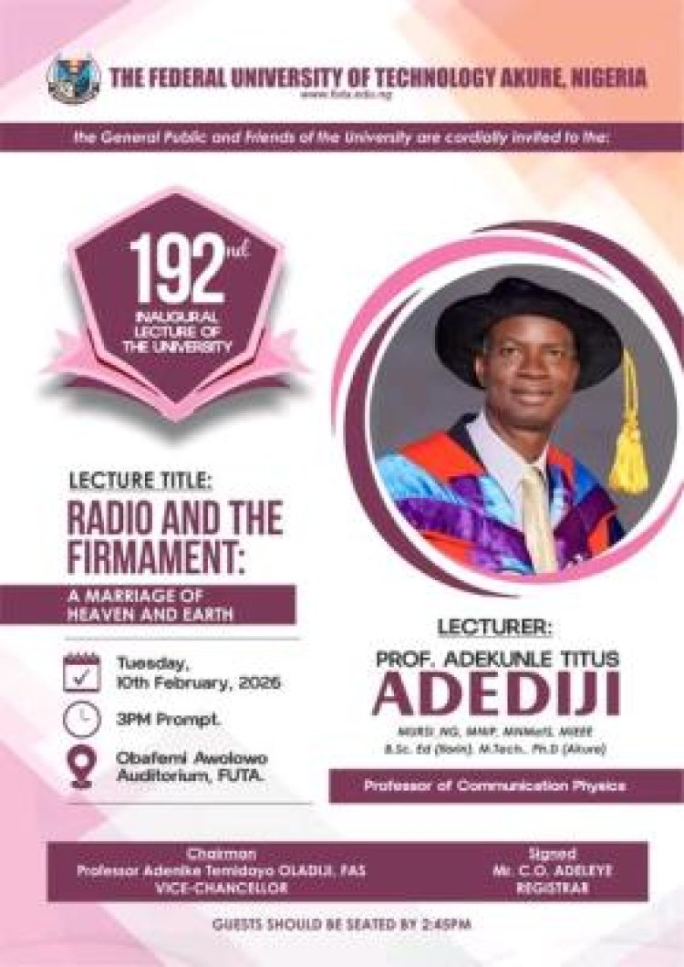 The Management of the Federal University of Technology, Akure (FUTA) has officially announced the date for its 192nd inaugural lecture.