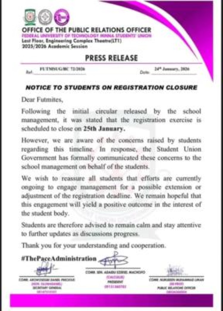 The Students’ Union Government (SUG) of the Federal University of Technology, Minna (FUTMINNA) has issued an official notice addressing the impending closure of course registration for the 2025/2026 academic session