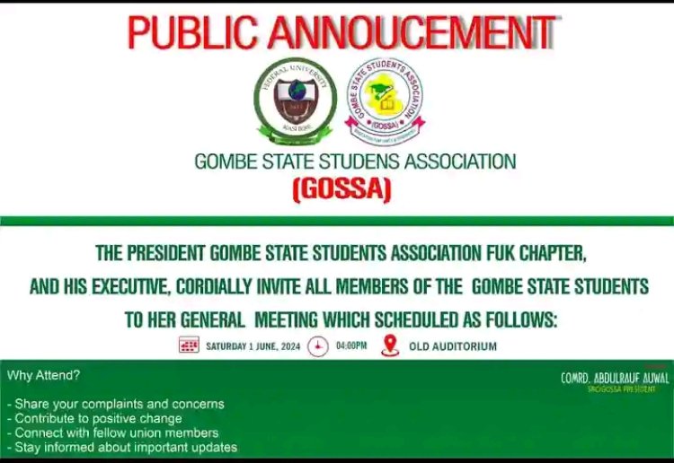 The President and Executive of the Gombe State Students Association, FUK Chapter, cordially invite all members to a General Meeting scheduled for: