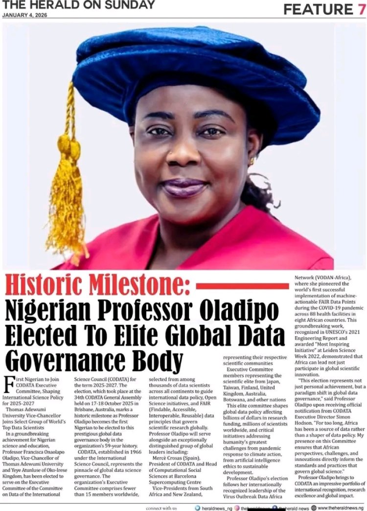 A respected academic and Yeye Atunluse of Oko-Irese Kingdom, Professor Oladipo’s election underscores her global recognition in data governance, research quality, and scientific standards. Her appointment positions Nigeria prominently within the international scientific and data governance community.
