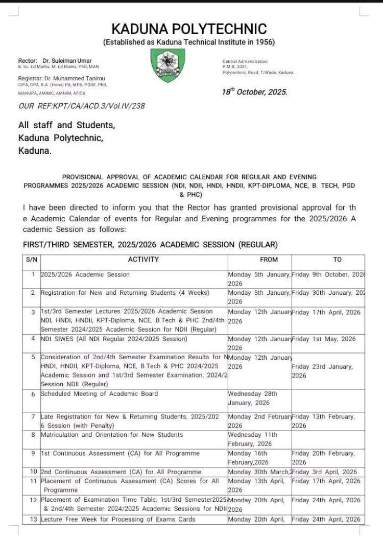 Kaduna Polytechnic has formally released the provisional academic calendar for the 2025/2026 academic session, covering all Regular and Evening programmes including NDI, NDII, HNDI, HNDII, KPT-Diploma, NCE, B.Tech, PGD, and PHC.