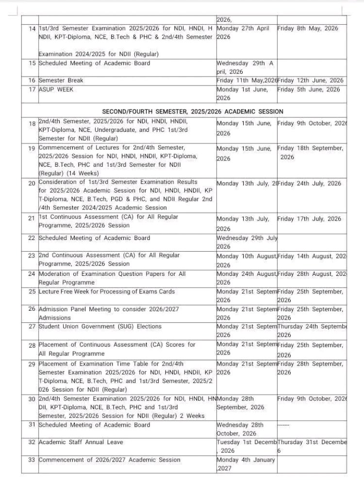 The calendar applies to all Regular and Evening students across Kaduna Polytechnic’s academic programmes.