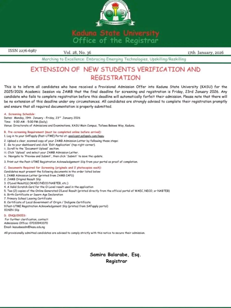 Kaduna State University (KASU) has announced an extension of the deadline for verification and registration of newly admitted students for the 2025/2026 academic session, following admissions offered through the Joint Admissions and Matriculation Board (JAMB).
