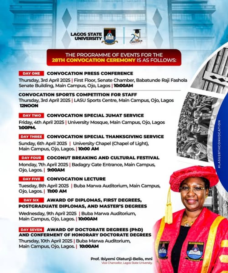 Lagos State University (LASU) has released the schedule for its 28th Convocation Ceremony, set to take place from April 3 to April 10, 2025. The event will feature a Convocation Press Conference, sports competitions, religious services, a cultural festival, and the Convocation Lecture.