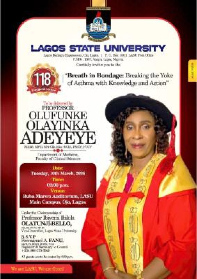 The lecture, titled “Breath in Bondage: Breaking the Yoke of Asthma with Knowledge and Action”, is scheduled for Tuesday, 10th March 2026, at the Buba Marwa Auditorium, LASU Main Campus, Ojo, Lagos.