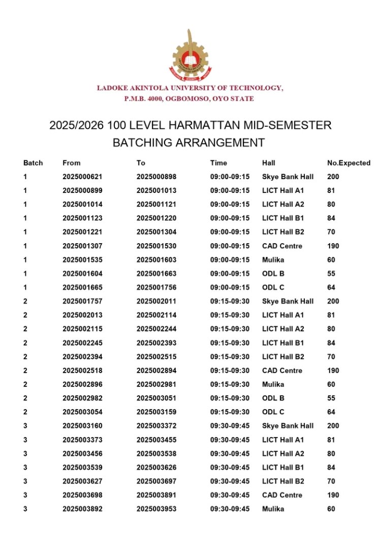 The Ladoke Akintola University of Technology (LAUTECH) has released the batching and procedural guidelines for the 2025/2026 Harmattan 100-Level Mid-Semester Tests.