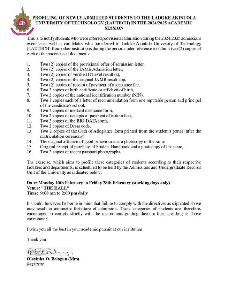 Ladoke Akintola University of Technology (LAUTECH) has commenced the profiling exercise for newly admitted students for the 2024/2025 academic session. This exercise applies to students who received provisional admission as well as those who transferred to the university from other institutions during the admission period.