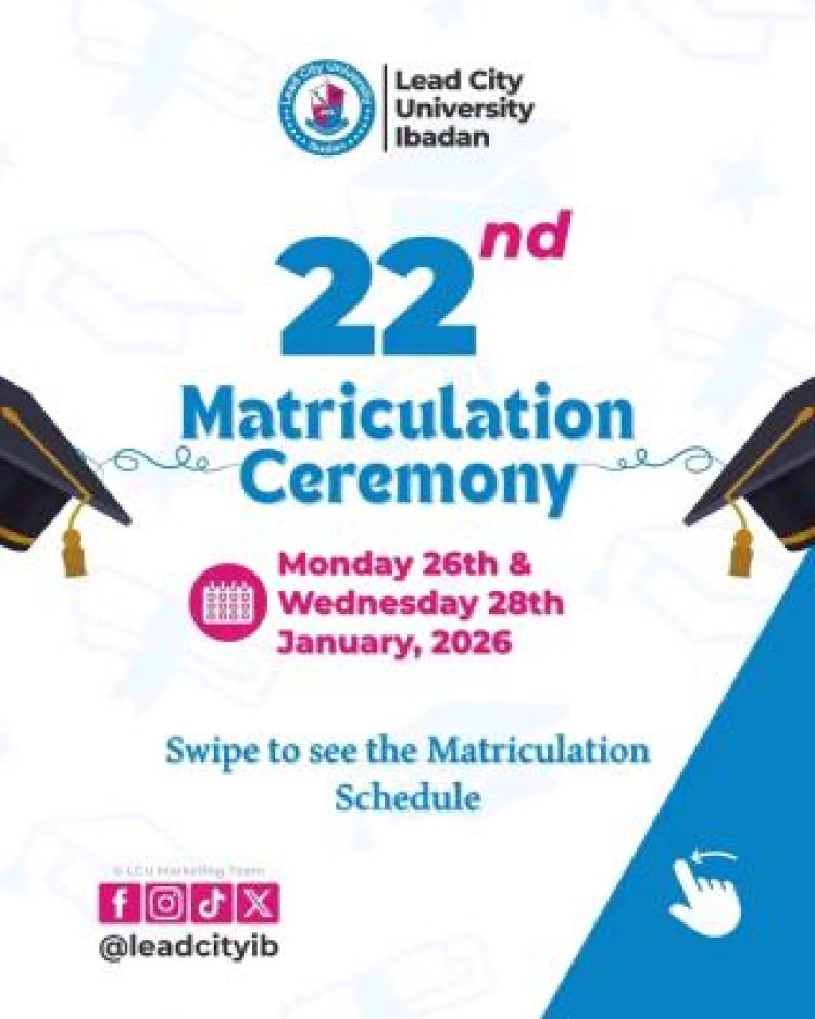 The Management of Lead City University, Ibadan has announced the schedule for its 22nd Matriculation Ceremony, welcoming newly admitted students into the university’s academic community.