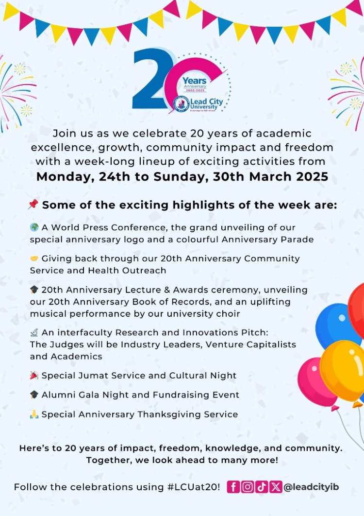 Lead City University (LCU) in Ibadan is gearing up for a grand celebration as it marks its 20th anniversary. From Monday, March 24 to Sunday, March 30, 2025, the university will host a week-long series of events to commemorate two decades of academic excellence, growth, and community impact.