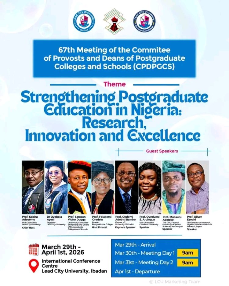 Lead City University, Ibadan, is set to host the 67th Meeting of the Committee of Provosts and Deans of Postgraduate Colleges and Schools (CPDPGCS), a high-level academic gathering focused on advancing postgraduate education in Nigeria.
