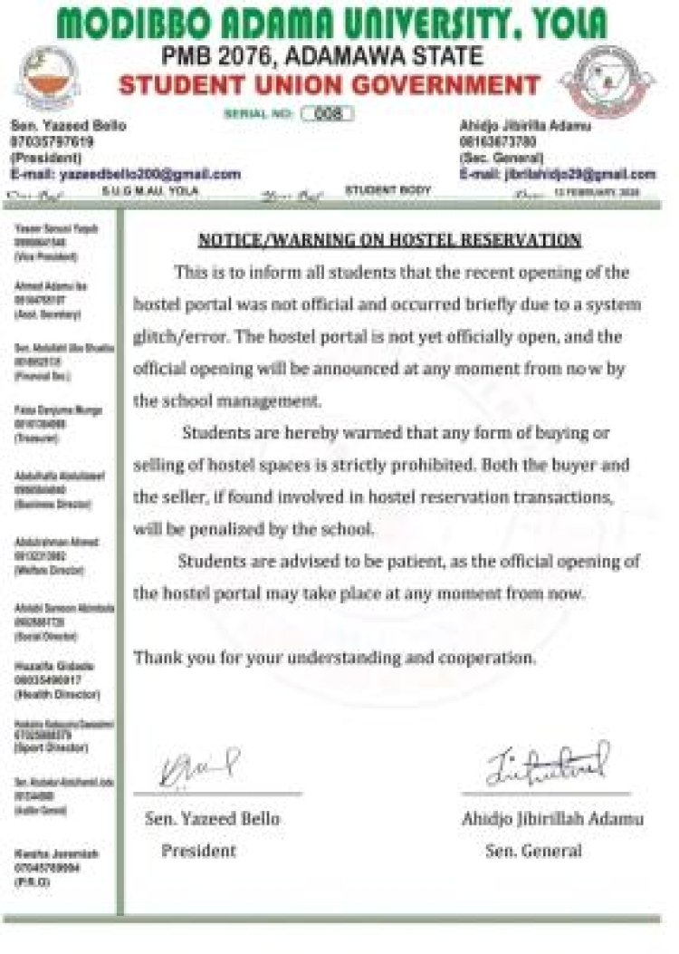 The Student Union Government (SUG) of Modibbo Adama University, Yola (MAU) has cautioned students against engaging in any hostel reservation activities following a temporary system glitch on the university’s hostel portal.